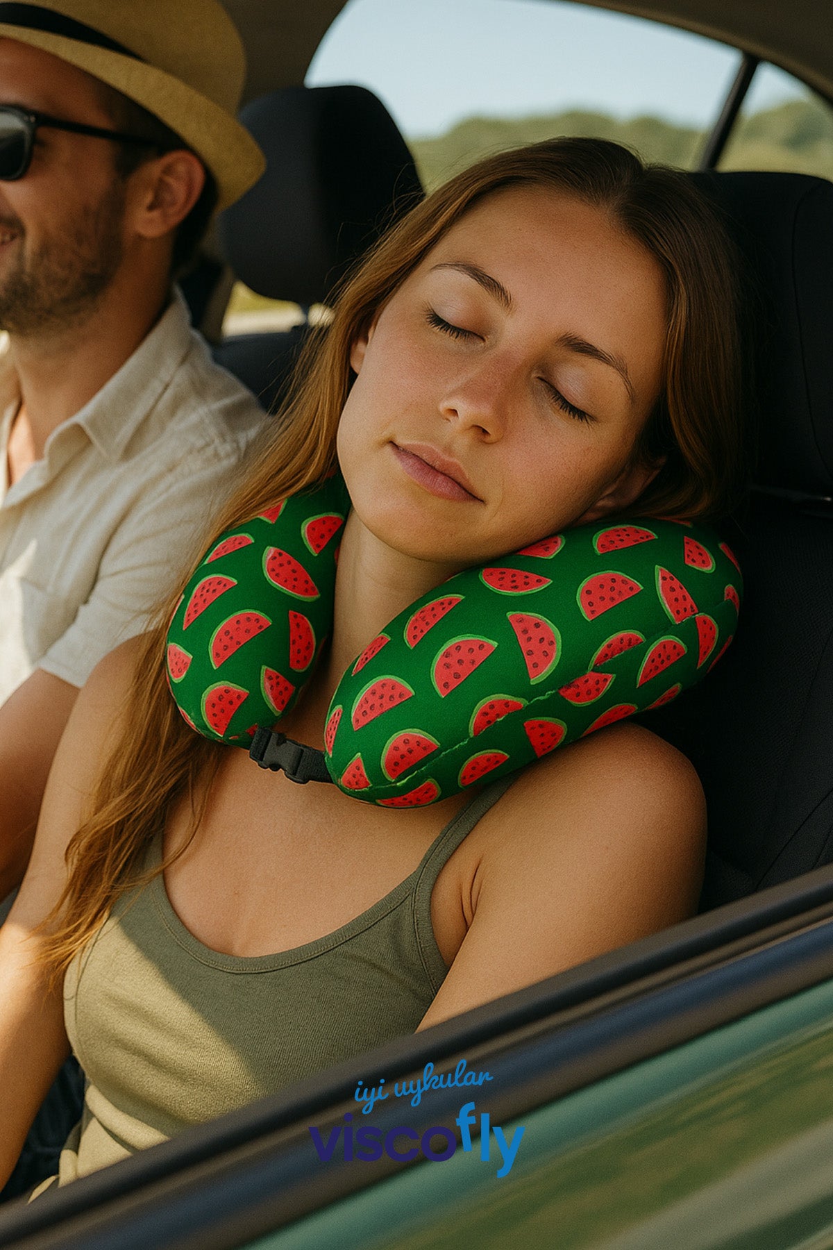 Visco Fly - Visco Seyahat Yastığı- Boyun Yastığı - 30*30*10 cm-% 100 Visco Dolgu-Kadife - Karpuz Desen