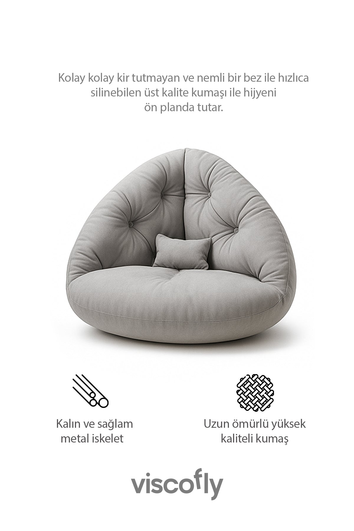 Yüksek yoğunluklu sünger dolgulu geniş minder, uzun oturumlarda dengeli destek sağlar. Silinebilir döşemelik kumaş günlük bakımı kolaylaştırırken, metal profil iskelet ve metal ayaklar uzun süreli ve stabil kullanım sunar.